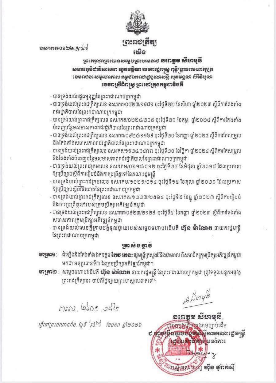 (ភ្នំពេញ)៖ ព្រះករុណា ព្រះបាទ សម្តេច ព្រះបរមនាថ នរោត្តម សីហមុនី ព្រះមហាក្សត្រ នៃកម្ពុជា បានចេញព្រះរាជក្រឹត្យត្រាស់បង្គាប់ដំឡើង និងតែងតាំងលោក កែវ រតនៈ រដ្ឋមន្ត្រីក្រសួងរ៉ែ និងថាមពល ពីសមាជិកក្រុមប្រឹក្សាអភិវឌ្ឍន៍កម្ពុជា (CDC) ទៅជាអនុប្រធានទី៣ នៃក្រុមប្រឹក្សាអភិវឌ្ឍន៍កម្ពុជា។ នេះបើយោងតាមព្រះរាជក្រឹត្យដែលបណ្តាញព័ត៌មាន Fresh News ទទួលបាននៅថ្ងៃទី២៩ ខែមករា ឆ្នាំ២០២៦នេះ។